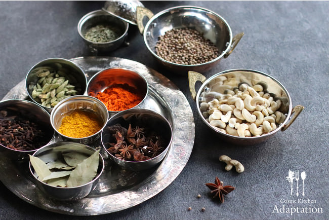 カイエンペッパー、コリアンダー、クミン、ターメリック、ガラムマサラ、生姜、にんにく、クローブ、ナツメグ