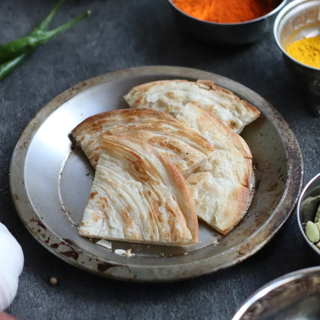 チャパティの生地をのばし、ギーを塗り、折り畳むことを繰り返してギーを層状に練り込み、薄くのばして焼いたもの。
