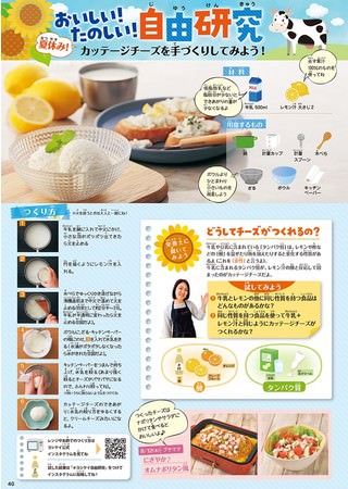 自由研究では、手づくりカッテージチーズを題材に取り上げました。世界最古のチーズのひとつと言われ、発酵・熟成なしで、短時間で作れ、食べてもおいしいカッテージチーズは、牛乳とレモン汁またはお酢だけで簡単に出来上がります。なぜ、レモン汁を加えることで牛乳が変化し、チーズができあがるのでしょうか? 酸や熱によって固まる蛋白質の性質を、誌面で手づくりカッテージチーズを使ったメニューとともに楽しく解説しています。また、レンジやお酢での作り方はヨシケイ公式インスタグラムでも紹介。子どもといっしょに作ったチーズの写真に「#ヨシケイ自由研究」をつけてインスタグラムに投稿して、夏休みを楽しみませんか。
