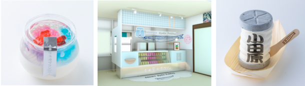 魚が泳いでいるようなプリン、小田原提灯を見立てたソフトクリーム、
