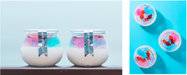 フィッシュゼラチン入りの白いミルクプリンの上に、水面のようにキラキラと輝くゼリーを乗せました。かわいらしいゼリーの魚が泳ぐ、小田原ならではの爽やかなプリンです。