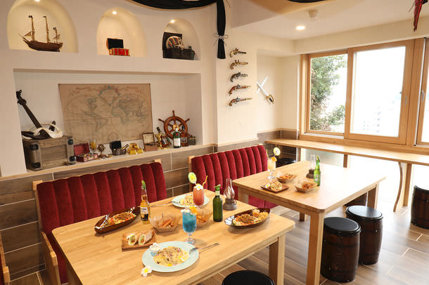 2階カフェ「海賊の隠れ家」カウンターからは海を眺めながら食事が楽しめる♪