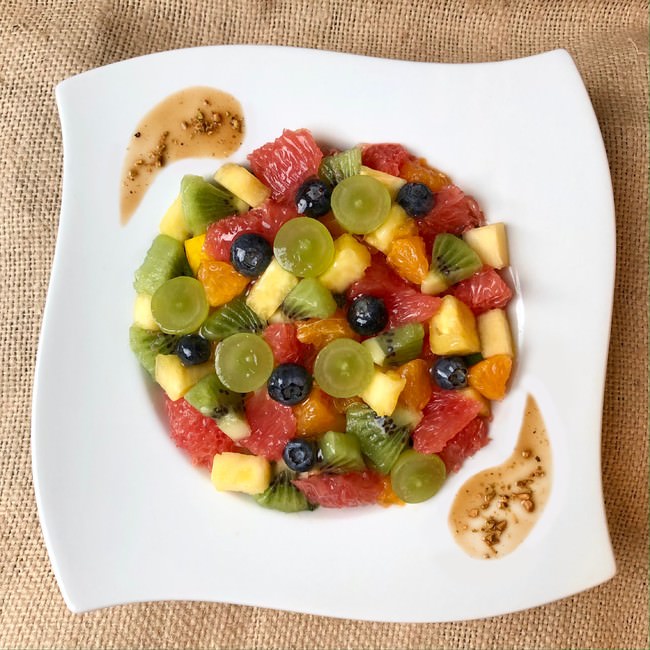 オレンジ、パイナップル、ブルーベリー、キウイなどのフルーツや、ズッキーニ、ブロッコリー、パプリカなどの野菜も摂れるフルーツタルトのように盛り付けられたサラダです。