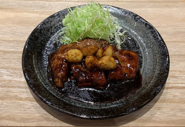 分厚く切った豚肉をニンニクと一緒に濃い目のソース、千切りキャベツ、ご飯がすすむ一品!