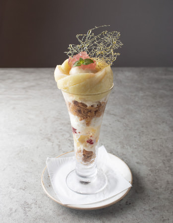 厳選した国産のフレッシュな桃を食べていただけるよう、シンプルに仕上げました。山椒のアクセントをきかせたジュレにサクサク食感のクランブルとフランボワーズの酸味がここちよい夏らしくさっぱり食べれる白桃パフェです。