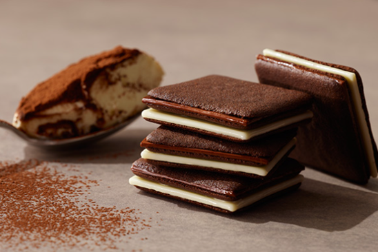 マスカルポーネ風味のホワイトチョコレートとコーヒーが香るミルクチョコレートを、軽い食感に焼き上げたクッキーでサンドしました。ティラミスの美味しさをぎゅっと一枚に閉じ込めた、スイートなサンドクッキーです。