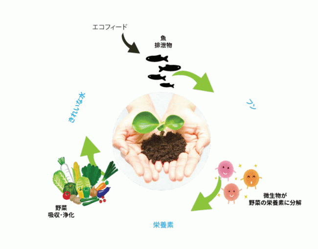同じ生けすで育てた水産動物の排泄物を微生物が分解し植物の栄養素となります。