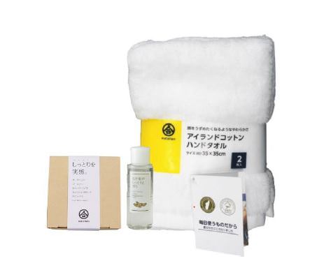 グループで共同開発したオーガニックホホバオイルをふんだんに使用した石鹸と、肌や髪、全身に使えて潤いを与えるホホバオイル、ハンドタオルのセットです。