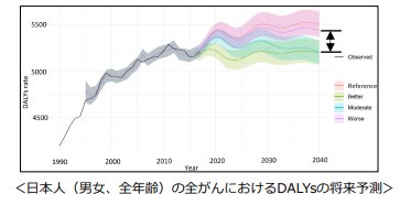 この推計は、健康日本21の目標である2023年中に日本人の野菜摂取量が350g/日になり、その まま2040年まで維持されると設定されたベターシナリオと、過去最低だった2004年の摂取量である240.2g/日が2040年まで減り続けるというワーストシナリオ、他2つのシナリオを設定し、DALYsにより評価したものです。