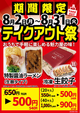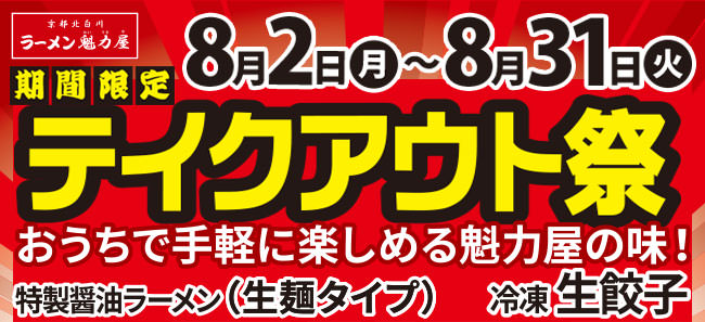 京都北白川ラーメン魁力屋をチェーン展開する株式会社魁力屋、(http://www.kairikiya.co.jp本社:京都市中京区、代表取締役社長:藤田 宗、以下魁力屋)は、2021年8月2日(月)より、「期間限定テイクアウト祭」を開催いたします。
