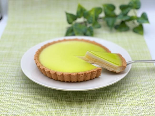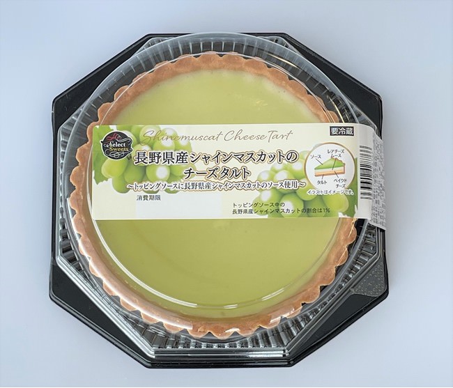 ベイクドチーズ生地にレアチーズムースを重ね、最後に、長野県産シャインマスカットを使用したソースで表面をコーティングした3層仕立てのさわやかなタルトに仕上げています。