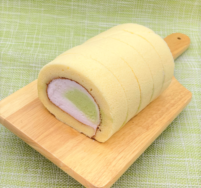 岡山県産ニューピオーネの果肉ピューレを使用したムースと、グレープ風味のホイップをしっとりふんわり焼き上げたスポンジ生地で、巻きました。淡い紫色のホイップで果皮部分、黄緑のムースで果肉をイメージしたロールケーキに仕上げています。