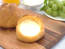 こんがりと焼き上げたシューパフに、特製シャインマスカットクリームを詰め込みました。このクリームには山梨県産シャインマスカットを使用したジャムを混ぜ込んでいます。
