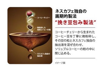 丁寧に微粉砕した焙煎コーヒー豆をネスレ独自のコーヒー抽出液と混ぜ合わせて乾燥し、ソリュブルコーヒーの粉の中に封じ込めるという、画期的な技術「挽き豆包み製法」を採用したコーヒーです。自然の恵みに育まれた“コーヒーチェリー”。そこから生まれるコーヒー豆。ネスレは、その豆を丁寧に焙煎し、微粉砕した豆の粒を大切に包み込み、カップの中まで届けます。ソリュブルコーヒーの粉の中に微粉砕した豆を封じ込めることで、豆の酸化の原因となる空気との接触を低減し、一杯ずつ淹れたての香りと味わいを生み出すことが可能となります。