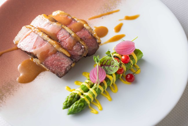 肉料理 和牛ステーキ 柚子胡椒味噌の炙り焼き アスパラガスのソテーを添えて