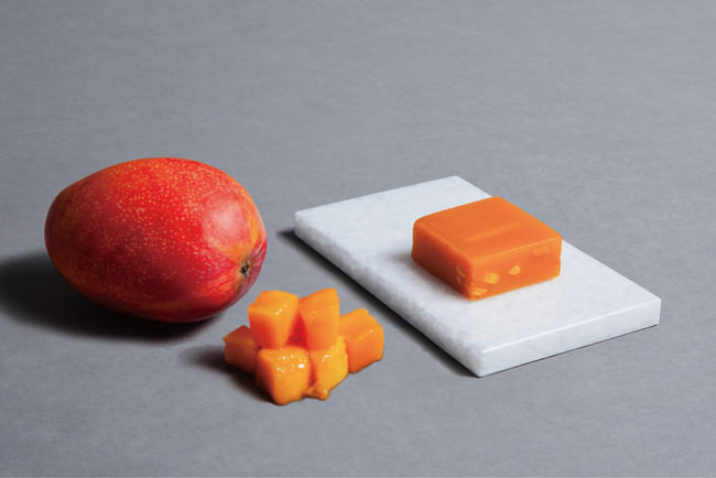 マンゴーのピューレで羊羹を炊き上げ、千切りにしたドライマンゴーを加えた贅沢な羊羹。