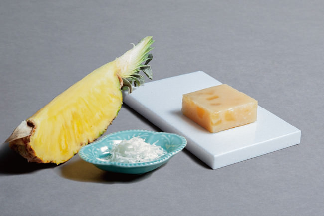 ココナッツクリームで羊羹を炊き上げ、白ワインでコンポートしたパイナップルを閉じ込めました。