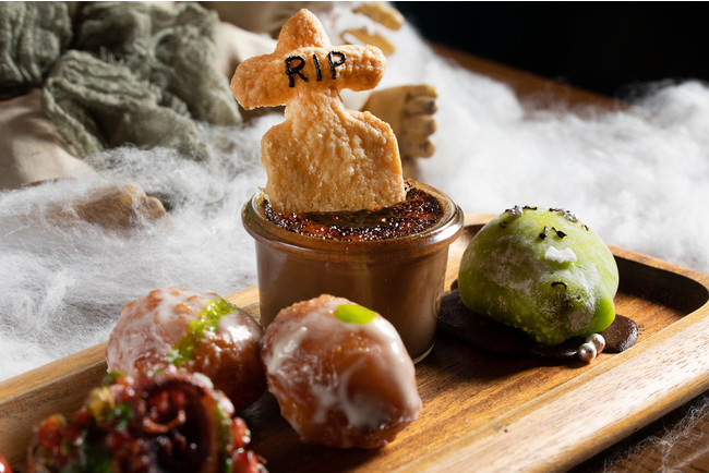 宇宙人をモチーフにしたチョコミント味のお餅スイーツやお墓に見立てたクレームブリュレなどのスイーツをはじめ、漆黒のマントが印象的なドラキュラをイメージして炭パウダーで真っ黒に仕上げるチキンウィングやかぼちゃの形のパンプキンバンズでつくるミニバーガーなどのセイボリーは、ホラー映画にインスピレーションを受けてアメリカ出身の料理長が考案した遊び心あふれるメニューです。ゲストの皆さまには、各スイーツとセイボリーがどのホラー映画にインスピレーションを受けているか想像しながらお楽しみいただきたいユニークなアフタヌーンティーです。