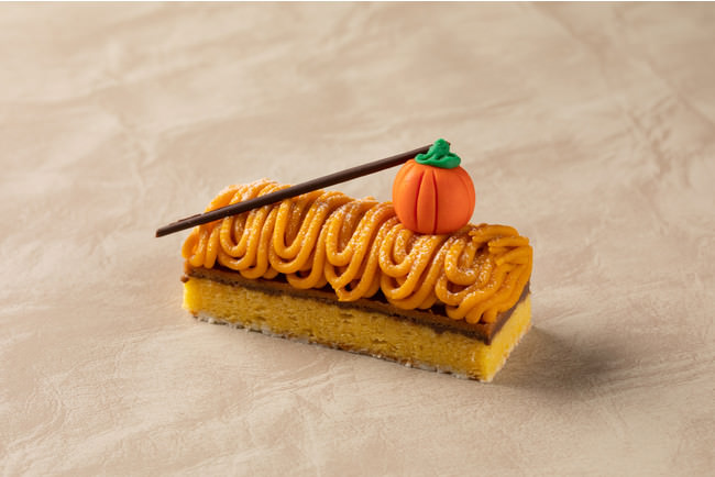 パンプキンパウダーとアーモンドパウダーを混ぜたスポンジの上に、フィアン ティーヌというクレープ生地を薄く伸ばして焼き上げてから砕いた物をトッピングし、サクサクとした食感をプラス。さらに甘さ控えめのホイップクリーム、その上に国産かぼちゃの濃厚なクリームを絞りました。素材の味を活かした、やさしい甘さが特徴のスイーツです。