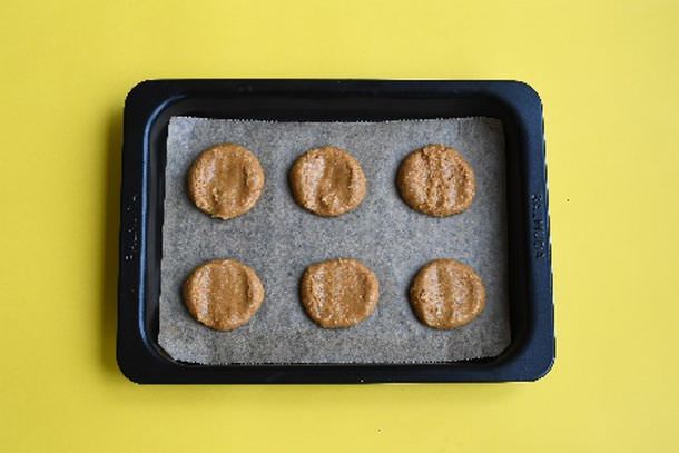 4. オーブンシートの上に丸めた生地をおき、3本の指で押しつぶす