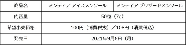 『ミンティア アイスメンソール』にはライムフレーバーを、『ミンティア ブリザードメンソール』にはレモンフレーバーをアクセントとして使用し、口寂しさ解消にもぴったりなキレのあるビターな味わいに仕上げました。気分や好みに合わせて選べるよう、ミントの清涼感の違いで2品を発売します。『ミンティア アイスメンソール』は鋭い冷涼感を、『ミンティア ブリザードメンソール』は凍てつく冷涼感に仕上げ、より強い清涼感にしています。パッケージには、「メンソールで さぁ、一服」のキャッチコピーを配し、『ミンティア アイスメンソール』は水色と黄緑色を基調とした爽やかなデザインに、『ミンティア ブリザードメンソール』は紫色と紺色を基調としシャープなデザインにしました。
