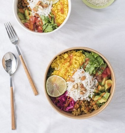 カレースパイスの効いたソイミートとターメリックで炊いたカルローズの相性が抜群。トマト、パクチー、アボカドなどたっぷりの野菜で食べるヴィーガンボウル。