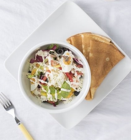 オープン当初から愛されているニース風サラダにカルローズをあわせてドンブリスタイルに。エビやアンチョビの具材にヴィネグレッドソースを合わせて。クレープに巻いて食べることでまた違った楽しみ方も。