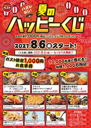 株式会社すかいらーくレストランツ(本社・東京都武蔵野市、代表取締役社長 大川原利明)が運営するガストでは2021年8月6日(金)より、「夏のハッピーくじ」キャンペーンを開催いたします。