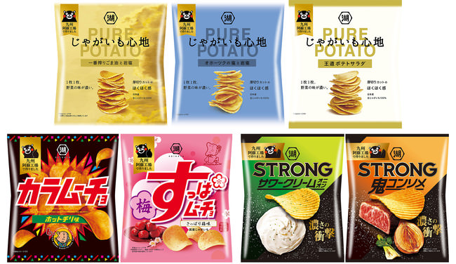 九州阿蘇工場で製造された湖池屋商品を通じて、熊本の元気と魅力を九州の皆様を中心にお伝えしたいとの想いから、九州阿蘇工場にて製造された商品(一部を除く)については、「くまモン」とともに「九州阿蘇工場で作りました」というコメントをデザインに加えた記念パッケージにて皆様にお届けします。