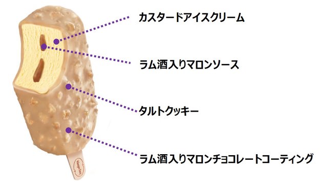 ほっこり甘いマロンソースが入ったコク深いカスタードアイスクリームを、サクサクと香ばしいタルトクッキーが散りばめられたマロンチョコレートコーティングで包み込みました。ほんのりと香るラム酒がマロンの豊かな風味を引き立て、秋冬にぴったりな大人の味わいのマロンタルトを表現しました。本商品は、2020年に引き続き今年も発売いたします。