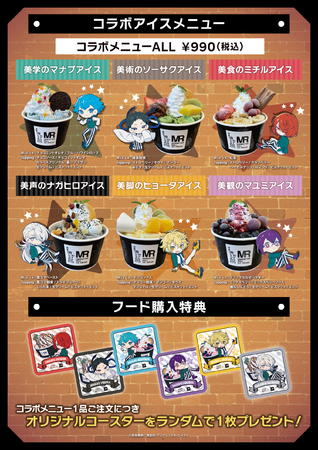 美少年探偵団に登場するキャラクターをイメージした、コラボメニューを6種類展開!また、コラボメニューを1品ご注文につき、マンハッタンロールアイスクリーム×美少年探偵団のオリジナルコースターを1枚プレゼント!(ランダムでのお渡しとなります)