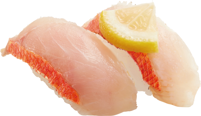 「生」はかっぱ寿司オリジナルの出汁醤油&わさびをのせて。「炙り」は塩がふられていますので、その上にレモンをしぼってレモン塩でお召し上がりください。高級魚「金目鯛」の繊細にして脂ののった味わいをぜひこの機会にお楽しみください。
