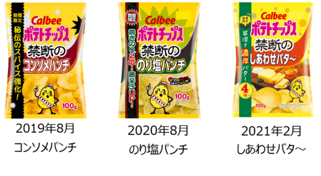 「禁断の」シリーズは、カルビーポテトチップスの定番フレーバーをベースにお客様の「食べてみたかった」を実現したセブン‐イレブン限定商品です。2019年8月にロングセラー商品「ポテトチップス コンソメパンチ」の“秘伝のスパイス”を強化した「禁断のコンソメパンチ」を初めて発売し、大きな反響をいただきました。これを受けて、2020年8月には「禁断ののり塩パンチ」、2021年2月には「禁断のしあわせバタ~」を発売しました。
