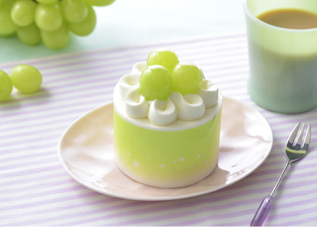 「シャインマスカット」を飾った、ひとりじめサイズのデコレーションケーキ。上面に絞ったヨーグルト風味クリームと、サンドしたマスカット風味クリームの爽やかな味わいが、シャインマスカットの華やかな香りと上品な甘みを引き立てます。