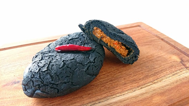 かつては世界一辛い唐辛子としてギネス世界記録にも認定された「ブート・ジョロキア」を使用した激辛カレーパン。竹炭いりの黒い生地に唐辛子をトッピングした見た目にも強烈な一品です。激辛好きな方や、辛いものでストレス発散したい方におすすめです。