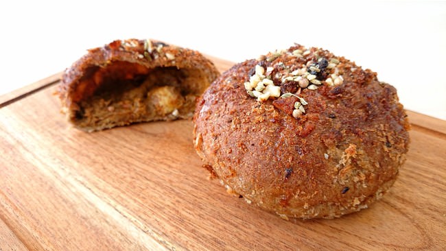 横浜・元町の人気ベーカリー。インドカレー店の作る本格スパイシーカレーを全粒粉の生地で包み、オリーブオイルで焼きあげました。仕上げに複数のスパイスとナッツを混ぜた「デュカ」をトッピングし、香りと食感にアクセントを加えました。