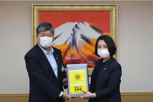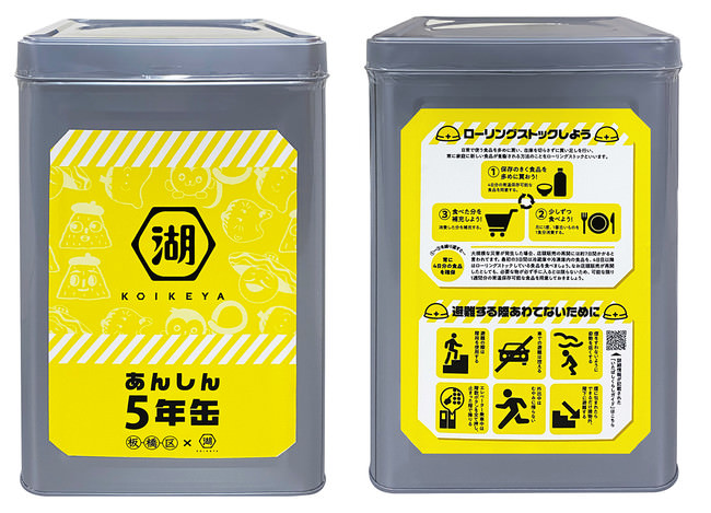 また、上記に加え、ポテトチップスの老舗である“湖池屋”ならではの表現にて『おうちで備える』という意識を高め、防災に対する心理的ハードルを下げたいとの想いから「KOIKEYA LONG LIFE SNACK」シリーズをはじめ、アルファ米や保存水など板橋区あっせん防災グッズ保存食5年セレクトセット(3日分)をセットにして、湖池屋オリジナルの一斗缶※に詰めた「板橋区×湖池屋 あんしん5年缶」を用意し、板橋区へ贈呈しました。