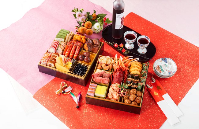 鹿児島県産黒糖ローストポーク/宮崎県産日向鶏の八幡巻き/鶏明太子クレープ/長州どりを使った手作りつくね/山口県秋穂産車海老の艶煮/宮崎県産黒瀬ぶりの照り焼き/宮崎県産日向夏のケーキ/福岡県産あまおうパウンドケーキ/他、豪華なイセエビのホワイトソース和えや宮崎牛A5ランクのローストビーフなど、こだわり抜いた九州の食材を中心に、伝統的な九州の味わいに仕上げました。素材にも、味にも、見た目にも、健康にも気を配ったおせち料理です。