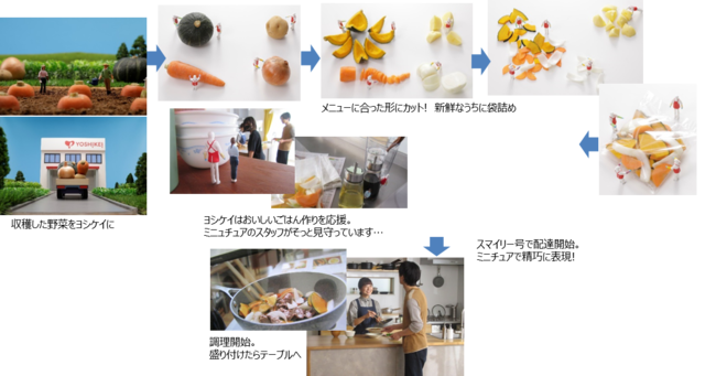 ヨシケイは、1975年の創業以来、食材宅配を通してお客様の食生活をサポートし、北海道から沖縄まで全国約50万世帯のお客様にご利用いただいています。ヨシケイのサービスは、その日に使う分だけの新鮮な食材をミールキットにしてレシピと共にお客様のお手元まで自社便でお届けすること。全国47都道府県にある65のフランチャイズでは、新鮮な野菜を加工して毎日お客様へとお届けしています。今回のCMでは、野菜を収穫、カットして、栄養士の考えたレシピといっしょに食卓に届ける様子をユニークで愛らしいミニチュアの世界の中で表現。映像に出てくるスマイルスタッフやヨシケイロゴの入ったスマイリー号のミニチュア、必見です!