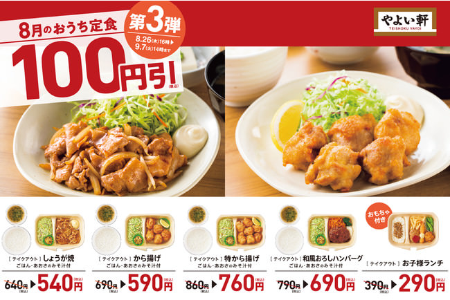 「やよい軒」のテイクアウト『おうち定食』は、発売以来3ヶ月で累計販売数100万食を突破するなど、大変ご好評いただいております。このたび、8月26日(木)16時より9月7日(火)14時まで、人気の『[テイクアウト]しょうが焼』や『[テイクアウト]から揚げ』など『おうち定食』5商品を100円引きの特別価格で提供いたします。