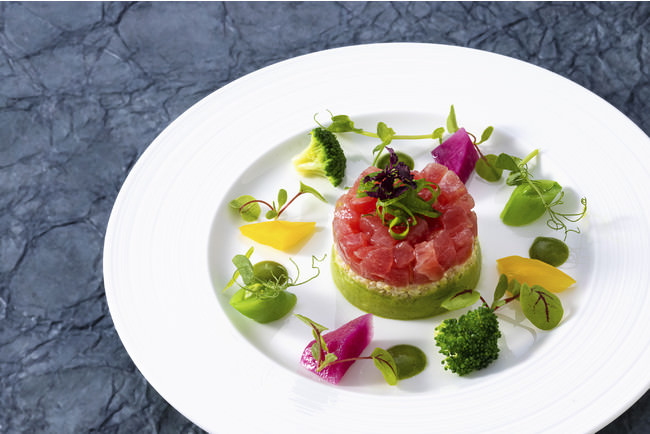 軽く醤油につけ炙ることで香ばしさをだしたマグロの赤身を、彩り豊かな野菜と共に華やかに盛り付けました。
