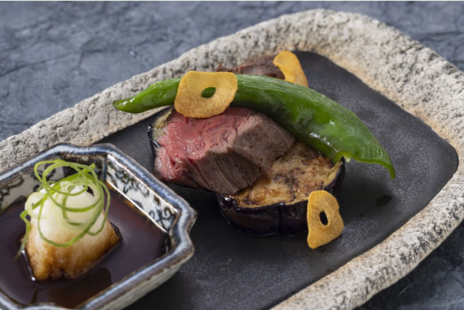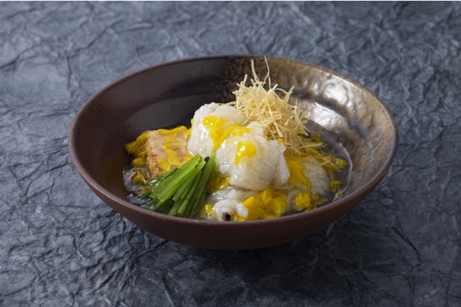 京都産の茄子を使用した真薯は、出汁の旨味があふれる秋らしい菊花餡をかけた、見た目にも美しい逸品です。軽く揚げた鱧や刻み湯葉といった京都を感じる食材や、野菜の飛龍頭とともにご堪能ください。