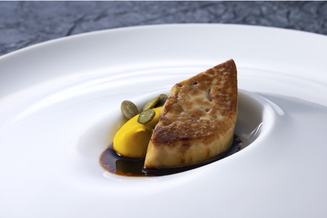 贅沢なフォワグラのポワレは、秋を感じられる京都産南瓜をつかったピュレと合わせてご堪能ください。トリュフの香りとまろやかな甘みが特徴のペリグーソースには、バルサミコの酸味を加え絶妙な味わいに仕上げました。
