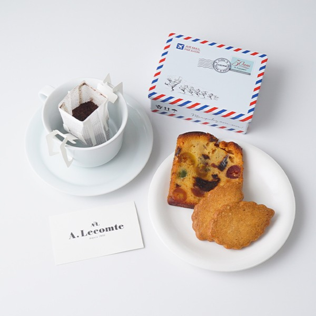 ルコント定番、たっぷりのドライフルーツとラム酒の蜜で仕上げた「フルーツケーキ」、バターをたっぷり使ったリーフ型の「サブレアマンド」、そして広尾本店のサロン・ド・テでも提供している「ルコントブレンド」のドリップコーヒーを詰め合わせました。パッケージデザインは、ルコントからのエアメールをイメージしています。