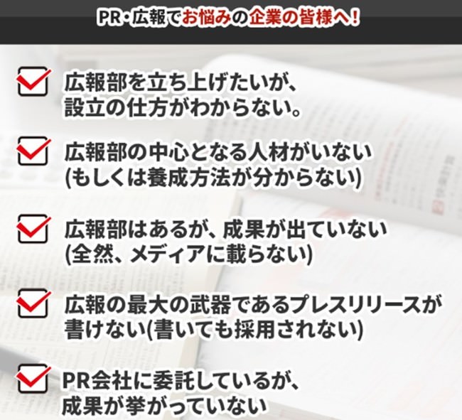 広報PR担当者を選出し指導することから、実際の業務の指導、社内における啓蒙活動、危機管理PRまで、広報PRに必要な全てをコンサルティングします。