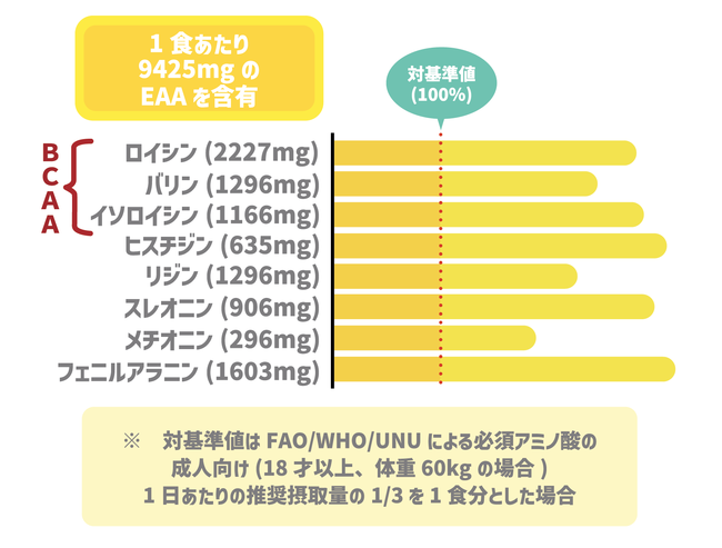 第3のプロテインとして注目を浴びている、エンドウタンパク( ピープロテイン) を配合することにより体内で合成ができない必須アミノ酸を1 食あたり9350mg の摂取が可能となりました。