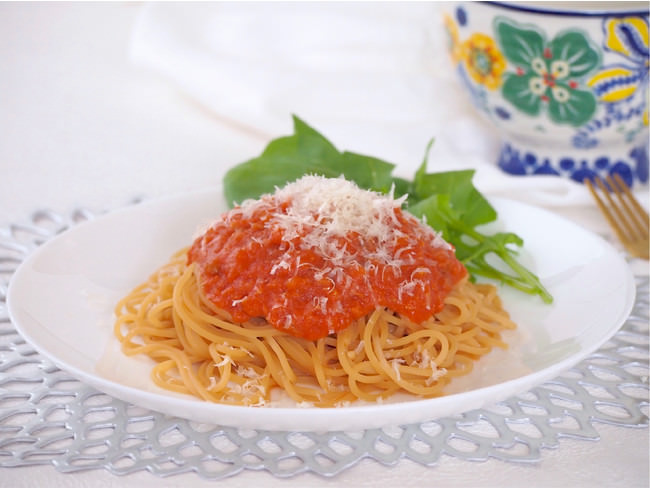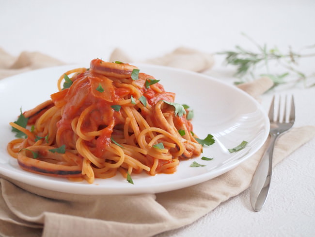 高タンパク質で栄養豊富なイカを旨味ごとトマトソースに加えました。オレガノとアンチョビが香る、コクのあるトマトソースです。