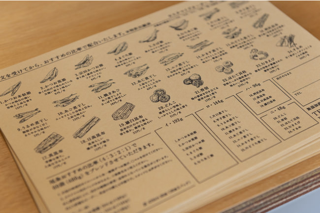 ・オーダーシートを用いてお好みの素材を複数選定し、配合を決めます。初めての方には旨味成分であるグルタミン酸、イノシン酸、グアニル酸などのバランスをとった、尾粂おすすめの黄金比でブレンドも可能。