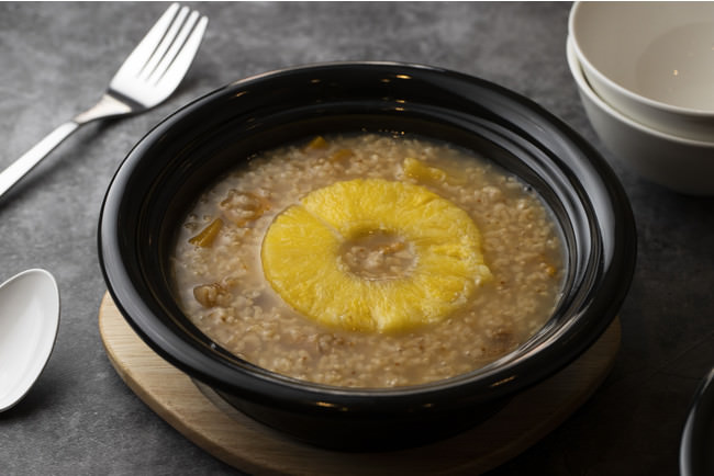 広尾のお粥バル「ファビュダイン」でパイナップル出汁のフルーティお粥とフローズンパイナップル入りスパークリングワイン(ノンアルコール)の夏限定セット2021Ver.を販売
