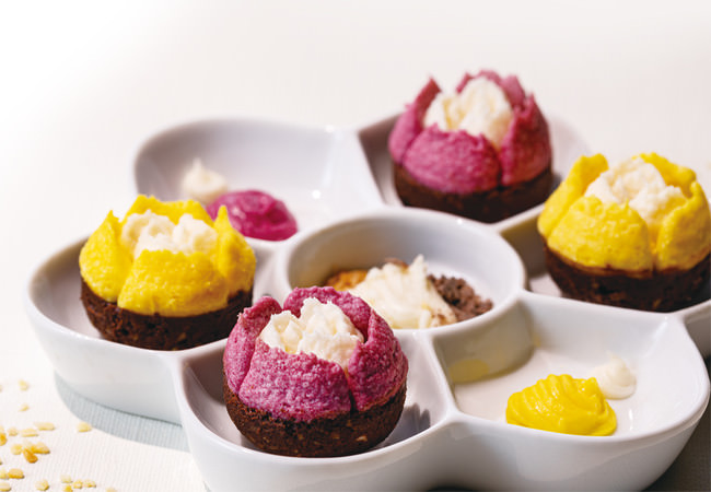 金井理仁シェフの代表作。可愛いチューリップと華やかなローズがひとつになった、とびきりよくばりなショコラスイーツです。繊細なラングドシャクッキー細工のチューリップの中に、とろけるホイップショコラのローズを咲かせました。甘酸っぱい「ベリー」、深みある「キャラメルナッツ」、爽やかな「パッションマンゴー」の3味のセット。